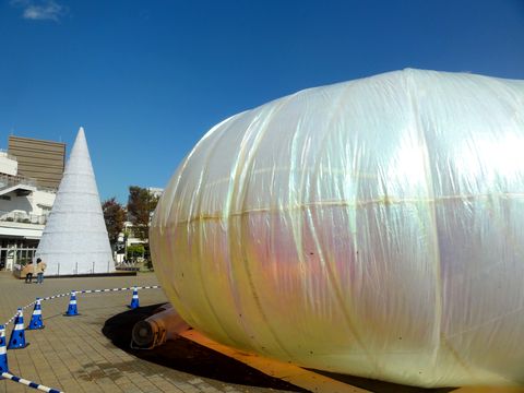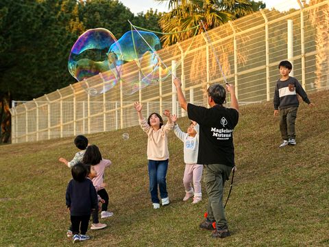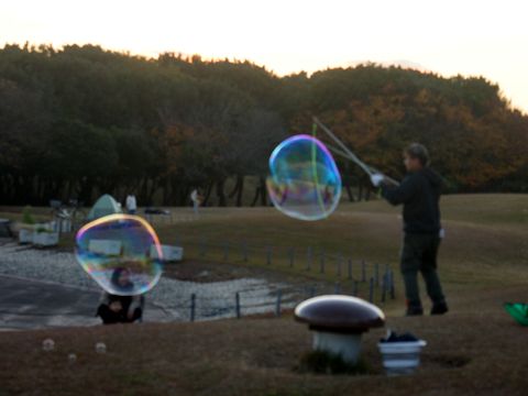 公園ではでっかいシャボン玉子どもたちは大喜びでシャボン玉を壊して遊んでいた。 |