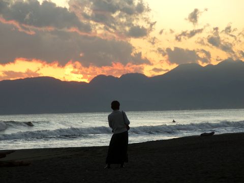 今日の辻堂海岸波が高くサーフィン日和、夕焼け空にはならず、残念。下はいつも撮影に来ている女性、話はするが名前は知らない、 NIKONのZFとズームレンズ使用。 |