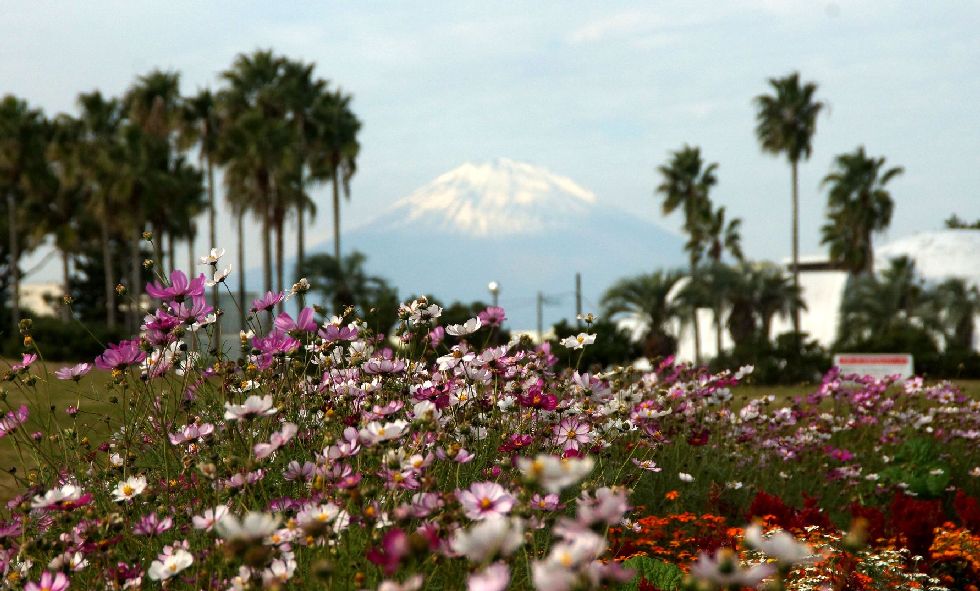 富士山とコスモス前回と同じ構図だが今回はAモード(絞り優先)F17で近くも遠方もピントが来るようにして撮影。 |