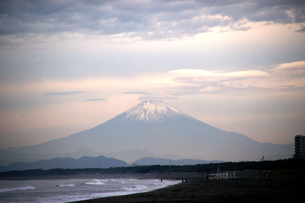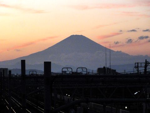 空が焼けて綺麗、富士山も駅前から辻堂駅西口の横断歩道橋から綺麗な富士山が見えて、通行人がスマホで撮影していた。 空にはピンクの雲が掛かってきれい。 |