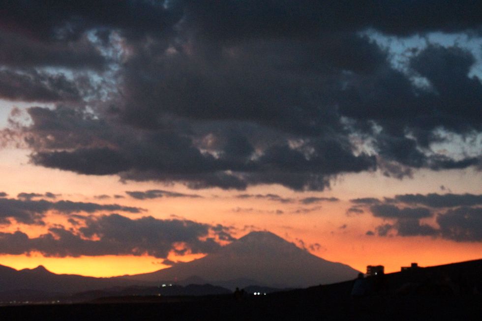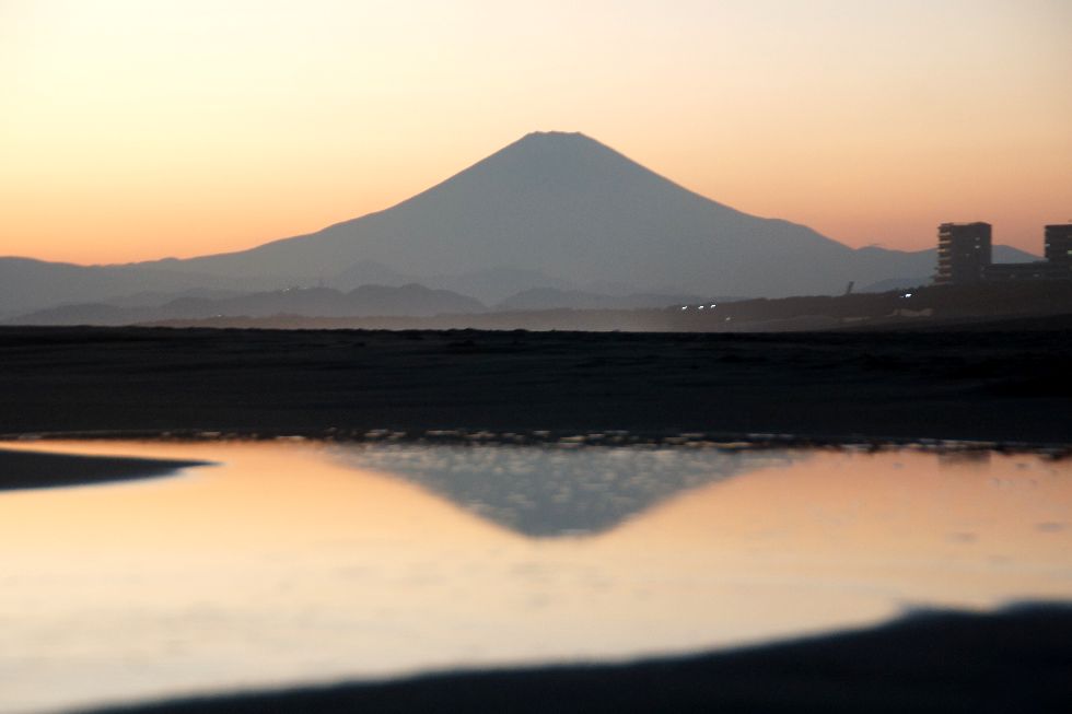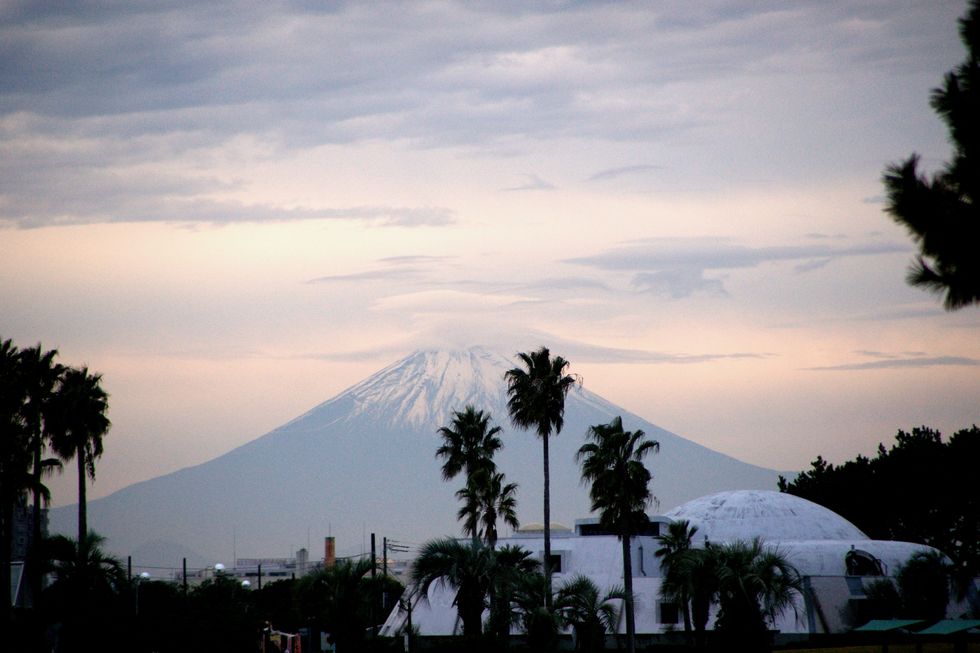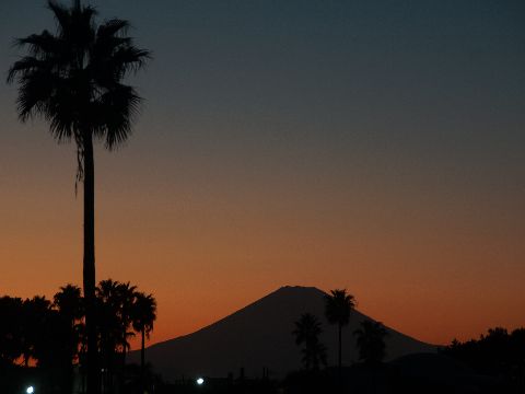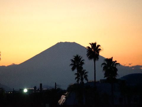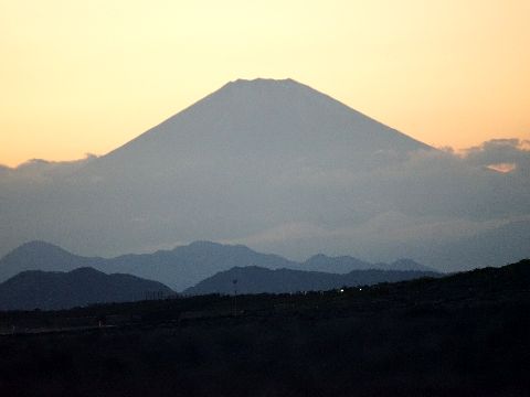 富士山・夕景空は雲だらけだったが日没後に富士山の周りだけ雲が切れて影富士の姿が見られた。 |