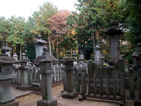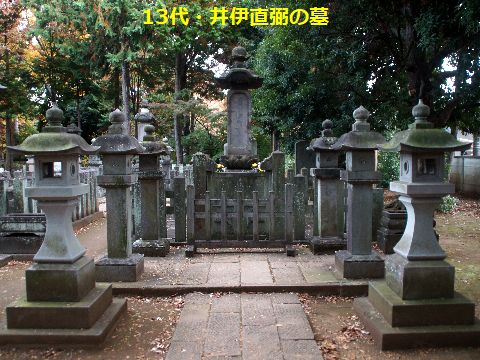 豪徳寺は彦根藩・井伊家の菩提寺入って右手奥にある井伊家の墓所、その一番奥の立派な墓が井伊直弼の墓。他にも2代目から 歴代の墓、正室の墓が並んでいる。井伊家は徳川幕府の主要な役割を受け持ち、藩主はほとんど 江戸で生活したよう、世田谷は井伊家の所領で上屋敷は江戸城・桜田門のすぐ近くにあった。 |