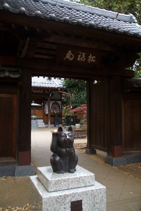 招き猫はすっかり定着?ここが招き猫のある招福殿の門(入口)、遂に入口に猫の像が置かれていた、外国人には解り難いので 目印のモニュメント? |