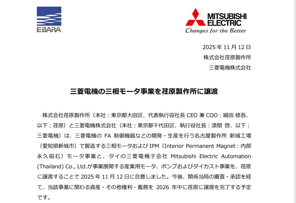 三菱電機・小型モータ事業を荏原へ譲渡突然の発表に驚き、日立に大幅に遅れを取っている三菱電機、機器事業で儲からないものは 切り出すという決断か?産業分野でもFA機器以外は勝っているものは少ない。NC関連のACサーボや 主軸モータは継続するとしているが長くは続くまい。放電加工機が強いが、NC装置をロボットと 共に維持していけるかも疑問。ポンプ専用設計のモータでCDが出来るかは未知数(片回転でよい)。 |