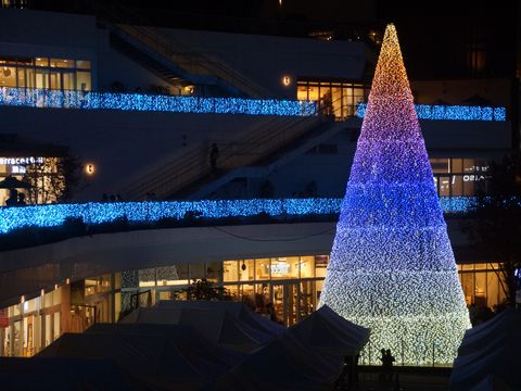 テラスモール湘南のクリスマスツリーツリー状の飾りは時間とともに色が変わるイルミネーションだそう、イベント絡みでも色が変わるよう。 |