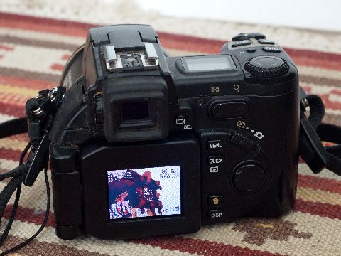 初めての電子ビューファインダ(EVF)10倍ズーム機で光学ファインダでは難しかったようでEVFを採用、画素数がまだ少ないのでピントは判らない。 背面の液晶モニタでもファインダと同じ画像が見られるが、やはり画素数が少なく実用性には限度あり。 |
