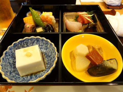 松花堂弁当この後に、てんぷら、ごはん、吸い物、漬物などが出た。 |
