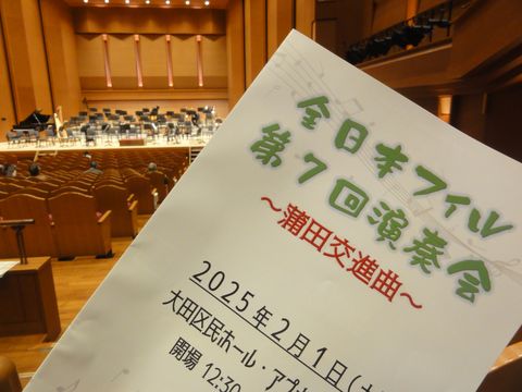 全日本フィル・第7回演奏会@アプリコ(蒲田)演目は、1)島崎藤村:「椰子の実」(合唱付き)、2)シベリウス:交響詩「フィンランディア」(合唱付き)、 3)ボロディン:交響曲第2番、4)ラフマニノフ:交響曲第2番、5)エルガー:「威風堂々」(合唱付き) 2025年1月25日(土)