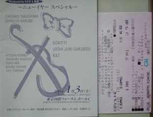 2002年1月6日(日) 東京国際フォーラム・ホールC めざクラの歌姫 吉岡小鼓音さんの美しい歌声。 注目の三味線プレイヤー 上妻宏光さんによる純邦楽とクラシックの融合。 フルートアンサンブル Lynxによる爽やかな演奏。 クラリネットの貴公子 赤坂達三さんの情熱的な音色。 スペシャルゲスト 南こうせつさんの心に染み入る歌声、ステージと客席が一体となったひととき。 |