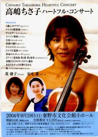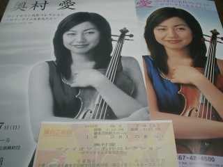 ![]() 2005年8月26日(金) この会場は初めてだったが、中庭に竹林があったりと良い感じ。 1500名規模で2/3位の入り。クラシックからラグタイム、ポピュラーまで幅広い選曲。終了後、サイン会があったが、もう買うCD無しで見送り。秋には新しいCDが出る予定とのこと。前から2列目のい左手で指の動きまで良く見えたが、チェロとの違いは大きい。 ステージ上では薄緑のロングドレスで大きく見えるが、サイン会でみると小柄な女性。伴奏者とともにジーンズというカジュアルな格好でサイン会をやっていた。 昨日は秦野だったが、入りはどうだったのかな? 鎌倉芸術館で奥村愛のバイオリン・コンサート