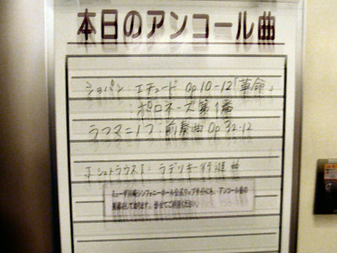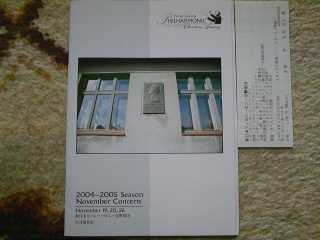 ![]() 2004年11月26日 (金) アルミンク指揮新日本フィルの11月演奏会、YAHOOでオケ後方の席を入手、満員ではなかったが、後方の席からはオケのメンバーが演奏の間の時間何をしているのか、が良く解り面白かった。 演目は、世界初演のグラウスのバイオリン協奏曲、正直なところあまり良く解らなかった。その後はヤナーチェクの死者の家から組曲、狂詩曲「ダラス・ブーリバ」、例の映画 隊長ブーリバの話と関連があるそう。 奥村愛ミニコンサート@銀座ヤマハ ![]() 2004年11月23日 (火) 午後3時から銀座ヤマハで奥村愛のミニライブがあるとの事で見に行った。大変な混雑で30分前に、店の中がもう人が一杯と言う状態。中2階から見たが、始まるまで30分以上も待ちくたびれた。約30分のステージ、印象は小柄なかわいい人という印象だが芯は強そう、だって一人でウィーンに住んでいるのであるから。昨年出たDVD付CDをYahooオークションで入札しておいた。ヤマハのサイレントバイオリンでのデモも2曲有ったが、やはり本物には敵わない感じ。 東京オペラシティ「東京シティフィル」コンサート ![]() 2004年11月12日 (金) 矢崎彦太郎presente「フランスの彩と翳」Vol.11「フランス革命、その後ー」という東京シティフィルの演奏会に行った。はじめてオペラシティホールへ、席はさすが500円で天井桟敷、乗り出さないと指揮者も良く見えない、ほとんど直角の配置で見にくいことこの上なし。演目は日本初?演奏のメユール「交響曲第一番」、ボイエルディ「ハープ協奏曲」、グノー「交響曲第一番」といったもの。来場者にワインがあたるサービスもあり、500円でワインを貰えれば大成功。 ミューザ川崎へ,東響コンサート