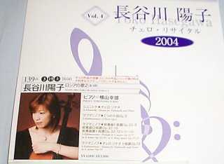 ![]() 2004年12月4日 (土) Yahooで偶然見つけ落札した藤沢市主催の湘南台トワイライトコンサート。若手女流チェリストである長谷川陽子によるベートーベンのチェロ協奏曲3曲のコンサート。満席ではなかったが前から2列目センタ近く、間近でよく見えたが右手で楽譜台の翳になって肝心の楽器は良く見えず。でも、多いに満足。CD即売会とサイン会もあったが今回はパス。帰路ははげしい雨模様となった。 再び、サントリーホールへ
