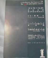 ![]() 2005年4月23日 (土) 無料で招待券をもらったので、コンサートへ。アマチュアオケのようだが結構メンバー多くて立派なもの。それでも弦楽器などはメンバーが常時不足のようで応援者が半数、メンバーは随時募集で歓迎という状況のよう。 大田区民ホールだが立派な設備、自由席だったので途中で2階席へ移動した。 ファゴット奏者・工藤淳子さんのミニコンサート