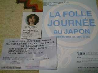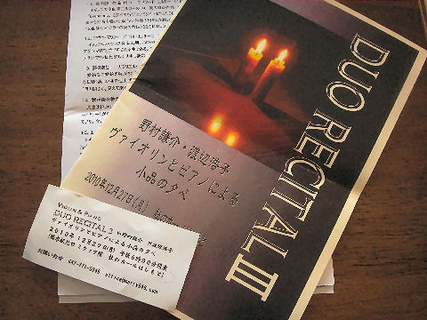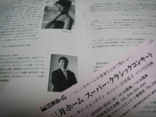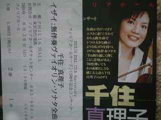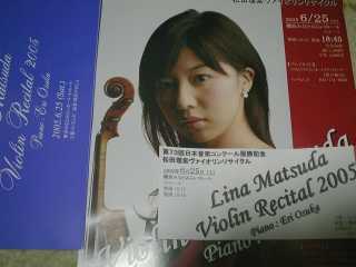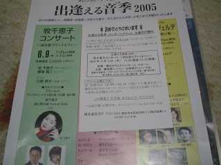 ![]() 2005年6月12日(日) 牛丼で昼食後、渋谷へ移動。タワーレコード6階での三浦友理枝のミニライブへ。一時間も前だというのに椅子席はもう満席、前回の工藤淳子とは大違い、昨日は銀座ヤマハでもあったはずだが。ひ弱そうな外見とは違う力強い演奏。ロンドン在住であと2年間修士課程を続けるとの事。コンクール入賞のご褒美での留学でなく、最初からイギリスやパリの音楽アカデミーで学ぶというスタイルに変わってきている。実力新人がどんどんと出てくるのも当然か。 CDへのサイン会も随分賑わっていたが、今回はパス、ヨーヨーマがモリコーネの作品を演奏した輸入版CDが安かった(1790円)ので買おうと思い試聴したが、ピンとこないので見送り。 みなとみらい小ホールで牧千恵子のバイオリンを聴く ![]() 2005年6月9日 (木) 今日はチェロのレッスンがお休み、 Yahooオークションで入手の招待券で。席は3列目のほぼセンターの好位置だった。 熟年の女性バイオリニスト、小ホールだったが2/3の入りといった感じ。後半はポピュラー曲や立原摂子作曲の作品を本人の演奏でのプログラム。 開場を待っている間、みなとみらいホールのチケットセンタで25日の松田理奈のリサイタルのチケットを購入、2500円で全自由席。チラシは品切れだったようでもらえず、でもホールの近くにスタンドにわずか2部残っていたので貰ってきた。 茅ヶ崎の千住真理子のコンサートへ