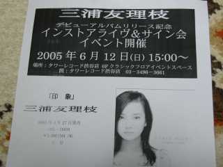 ![]() 2005年6月25日(土) みなとみらい小ホールでのリサイタルへ。全席自由のため開場30分前から並び列あり。一番前列の左手の指使いが良く見える席で鑑賞。まだ20歳で初々しいさ一杯だったが、新人とは思えない安定感?あり。アンコールは何とアベマリアとチゴイネルワイゼンという豪華?なもの。 三浦友理枝のミニライブ@渋谷