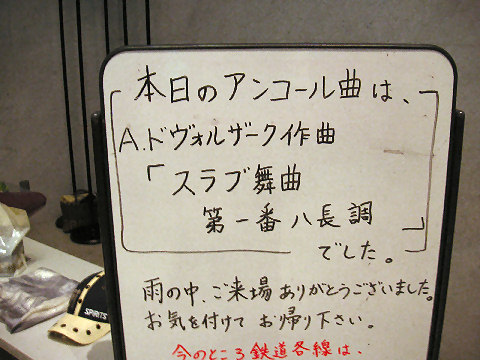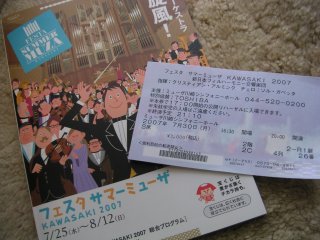 2007年7月30日(月) 新日本フィル・アルミンクで、エルガーのチェロ協奏曲とベートーベンの第4交響曲。チェロは有望若手の女性チェリスト(ソル・ガルベッタ)のアンコール曲はチェロの倍音を高度に?使った難曲。どこか夏の幽霊の出囃子みたいな始まりと終わりの印象だった。 全70分という予定がアンコールと拍手続きで10分延びた。一旦止んだ雷雨が降り出し帰路は大変だった。そういえばお昼は落雷で電車も止まったし。 久しぶりのコンサートは「ふれあいコンサート」