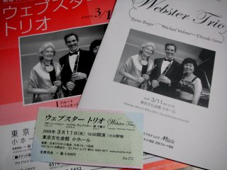 ![]() 東京文化会館のコンサートへ ウェブスター・トリオというピアノ、フルート、クラリネットのトリオのコンサート。平日の夕方で年配者が多く、ほぼ満席。招待券の人も多いのかも。 2009年2月28日(土)