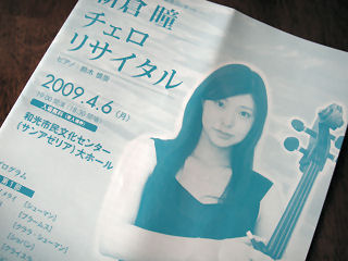 ![]() 遠藤真理のリサイタルへ(相模大野) 相模大野グリーンホールでのリサイタルに、全指定席で1000円と割安。地元・相模原市の出身?のせい。前半は小品主体、後半はメンデルスゾーンの曲。チェロ・ソナタではピアノ主体のようなピアノの大活躍。アンコールはラベルの小品とサンサーンスの白鳥だった。 2009年6月8日(月)
