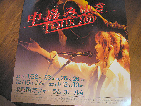 ![]() 中島みゆきTOUR2010 中島みゆきのTOUR2010へ、16列目のセンタブロック近くという良い席に。6時半から15分の休憩を挟み終わりは9時15分、たっぷりと歌と語りを楽しめた。 時間があったので銀座・有楽町あたりのクリスマスのライトアップを鑑賞、軽い食事をマックで。 2010年9月24日(金)