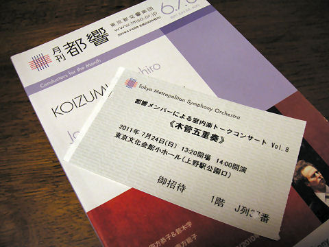 ![]() 東京文化会館へ木管五重奏を聞きに オークションで安いチケットが手に入ったので上野へ木管五重奏を聞きに。右の耳もどういう訳か復旧、まとも?に聞こえるようになり高音感度も上がったようでキンキンするが。 2011年5月5日(木、祝)