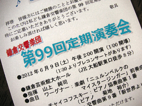 ![]() 鎌倉芸術館・鎌倉交響楽団 曲目はチャイコフスキー「イタリア奇想曲」、メンデルスゾーン・4番「イタリア」、グラズノフ・第5番というもの、3曲目は初めて聞いた曲。開始前に鎌倉市の曲の演奏もあり。 鎌倉芸術館は来年1月から改修工事なので次回演奏会はみなとみらい・大ホールだそう。 2016年6月12日(日)