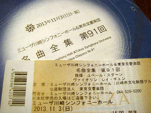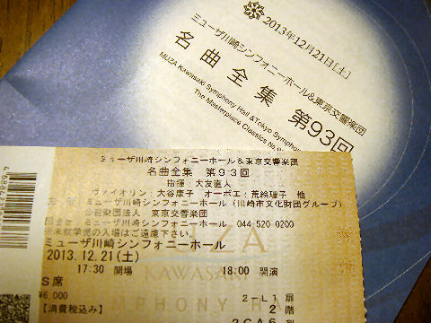 ![]() 今年最後のコンサートで第9を聞く 演目はバッハの「バイオリンとバイオリンのための協奏曲」とベートーベンの「交響曲第9番(合唱付き)」,年末の定番プログラム。大編成のオーケストラとそれに負けない合唱団の大迫力を楽しめた。 アンコールでは合唱隊もオケも小さなペンライトを揺らし照明も落として綺麗な蛍の演出で終幕。 アンコールでは直ぐ脇の席にソロのバイオリンを演奏した大谷康子がきて大いに拍手していた 2013年11月30日(日)