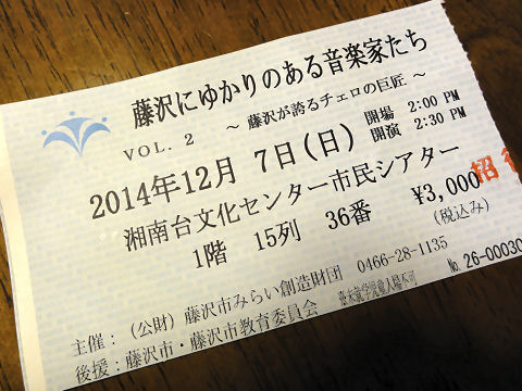 ![]() 堤剛のチェロ:藤沢ゆかりの音楽家Vol.2@湘南台 久しぶりのチェロ独奏を聴く、ポピュラーと違いマイク・PA無しの音の綺麗さを再認識。 演奏曲目は次の通り 1)ベートーベン:モーツァルトの「魔笛」の「恋を知る男達は」の主題による7つの変奏曲 変ホ長調、 2)ブラームス:チェロ・ソナタ第1番 ホ短調 このあと休憩15分、 3)メンデルスゾーン:協奏的変奏曲、 4)ファリア:スペイン民謡組曲、 5)ショパン:助走と華麗なポロネーズ ハ長調 アンコール 6)三好晃:曲名不詳、 7)サン=サーンス : 組曲『動物の謝肉祭』より第13曲「白鳥」 2014年12月6日(土)