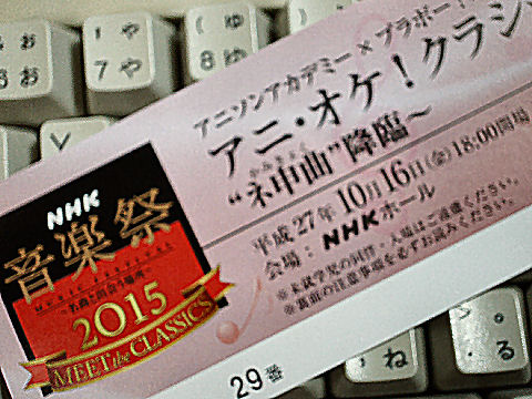 ![]() NHK音楽祭:アニ・オケ・クラシックへ 6時開場・7時開演だったが30分ほど並び入場、席は1階14列の右手(ランダムに配布)で司会者の表情までは見えないがオーケストラの鑑賞にはほどほどの席。 客層はアニメオタクからクラシックファンまで幅広い感じ(右隣はアニメ脳のにいちゃん)。初めて水木一郎と中川翔子を直接見た。 10年以上ぶりにNHKホールへ入ったが作りの古さ、老朽化での痛みも目立つ。最近の新しホールの良さに比べるまでもないが(演歌など放送用とクラシック用の兼用で中途半端な音響特性などもあり)。クラシックの演目はブラームスの交響曲1番(第一楽章)、ラベルのボレロ、ドボルザーク・新世界より(第四楽章)、ヘンデルのオラトリオから「ハレルヤ・コーラス」といったもの。 2015年9月28日(月)