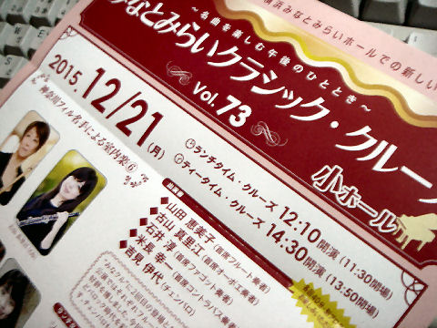 ![]() みなとみらい小ホールでミニコンサート 久しぶりにみなとみらい小ホールでのコンサートに、前に来たのは何年前だろうか。今回の演目はバッハのフルート協奏曲、テレマンのターフェルムジーク(要は貴族の食事のBGM)、アンコールにバッハのクリスマス・オラトリオの抜粋。 2015年11月17日(火)