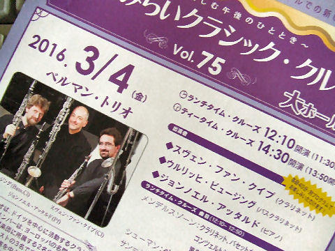 ![]() みなとみらい小ホールでミニコンサート 3回セットのミニコンサートの最終回、ドイツのトリオ。クラリネット、バセットホルンとピアノという3人組、バセットホルンは初めて見たが長いので下に支える足がチェロのようにあった、低い優しい音がする。 2016年2月10日(水) ![]() みなとみらい小ホールでミニコンサート 1時間足らずの短いコンサート、サックス・クインテット+ピアノで映画音楽の特集だった、サックスは4本、ソプラノ・アルト・テナー・バリトンと揃っていた。 |