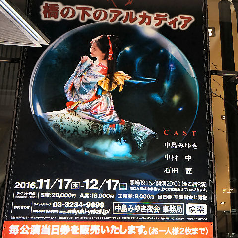 ![]() 中島みゆき・「夜会VOl.19 橋の下のアルカディア」 もう中日は過ぎているが「夜会VOL.19」を見に赤坂サカスのACTシアターへ。狭いので臨場感は十分だが換気が悪いのか匂いが気になる。 今年のテーマは再演だがだいぶ変わっているよう、中村中の歌唱が増え筋書も明確になった感じ。 60分づづの公演が20分の休憩をはさんで行われた、最後に全員が舞台から挨拶してお終い。アルカディアとは「理想郷」のことらしいが、「橋の下」は過去の人柱の逆説表現かな。 最後の零戦が飛び立ってゆくシーンで終幕。 2016年10月29日(土)