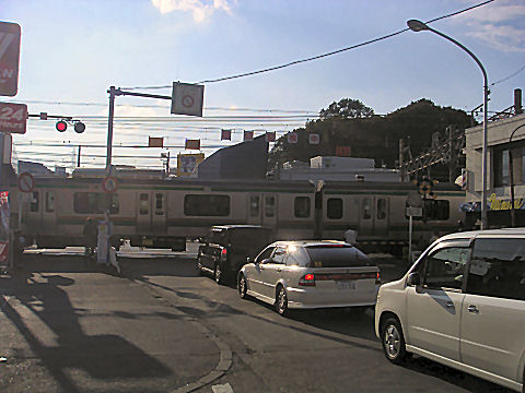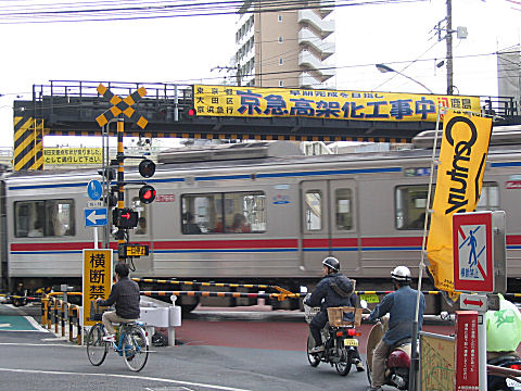 もうじき無くなる蒲田の地上交差 交通量の多い国道と最近電車が大幅に増えた京急・羽田線の踏み切り。連続高架化の工事が思ったより進行中、もうじきこの踏み切りも無くなってしまう予定。 六郷の古い橋の旧構が残っていたが尋ねる人は少なそう、その後 六郷橋を渡ったが結構歩いている人が多い。ずっと進むと時折訪ねるジャンク屋の前。砂子通りに出たところでゴール。 |