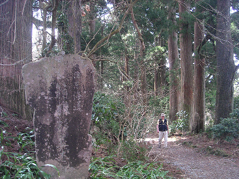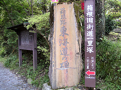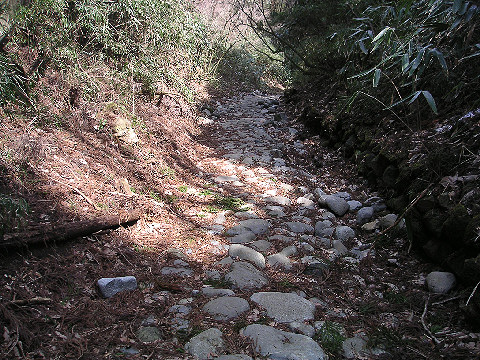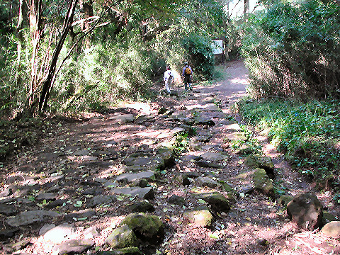 箱根峠までは登り(824m?)だが、後はほとんどが急な下りの連続。脚を取られそうになるうえ、玉石の石畳は歩きにくく滑りそうで危ないが、結構飛ばして下りを踏破。 |