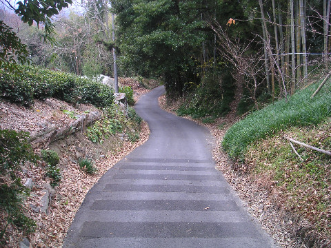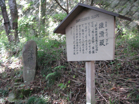 上は尾根道から日坂宿へ降りる道、車は通れないと書いてある急勾配と急カーブの連続で山を降りる。一里塚は途中2箇所、いずれも復元したもの。 |