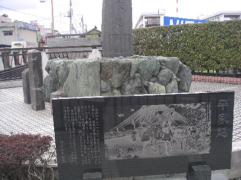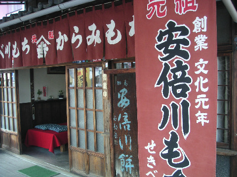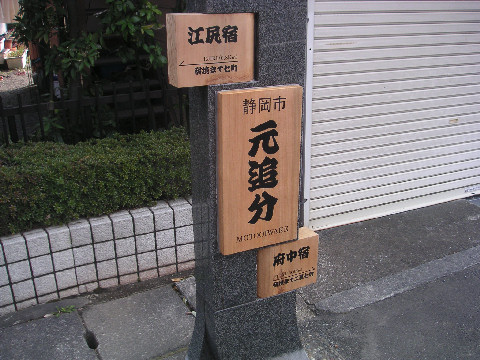 朝6時に出て、静岡駅前を10時前にスタート。市内はややコースが判り難かったがクリアして、次の「丸子(マリコ)」宿ををめざす。安倍川前に新幹線でも売っている「安倍川もち」の店あり、やり過ごして橋を渡るが水量が少ない、江戸時代も水量の多いときだけ渡しがあったとか。 |